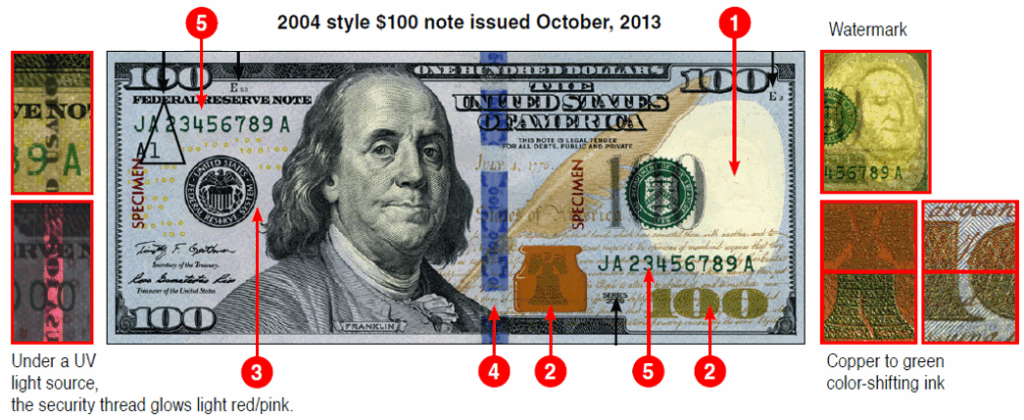 4. 3-D Security Ribbon – Blue ribbon woven into note which moves when tilted side to side or up and down ($100 bill only)