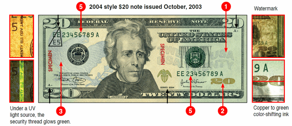 2. Color Shifting Ink – Shifts from copper to green as bill is tilted 45 degrees (except $5)