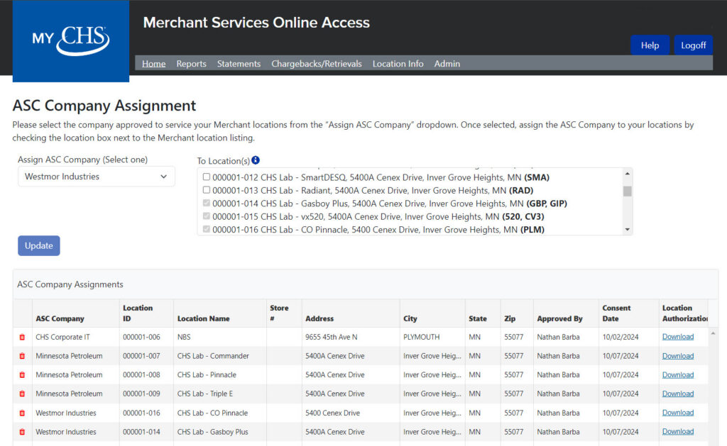 The designated Master Merchant within MSOA must assign portal access to the ASC company for the specific merchant locations they will service.